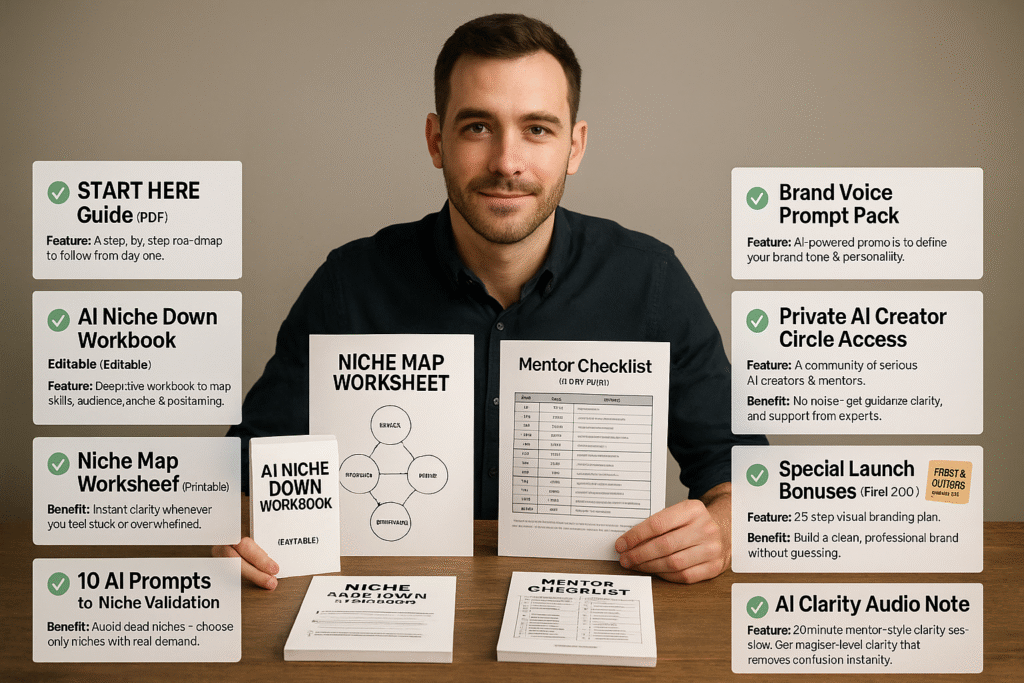 This powerful $17 foundational system helps creators, marketers, freelancers, and entrepreneurs unlock clarity, find their true niche, and build a structured, AI-powered digital brand system—without needing an audience, virality, or paid ads.