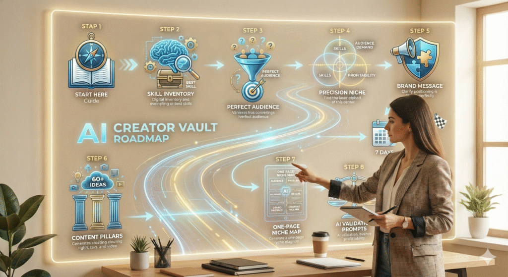 The AI Creator Vault™ Niche Foundation Kit is Stage 1 of a 5-stage journey designed to take you from scattered ideas → to clarity → to long-term automated income.